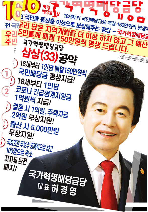 우선 이번 21대 국회의원 선거에 출마하면서 허경영이 내세운 공약에 대해 살펴보겠습니다. 첫번째는 ‘18세부터 1인당 매월 150만원씩 국민배당금 평생지급’, 두번째는 ‘18세부터 1인당 코로나 긴급생계지원금 1억원씩 지급’, 세번째는 ‘결혼 시 1억원, 주택자금 2억원 무상제공’, 네번째는 ‘출산 시 5,000만원 무상지원’, 다섯번째는 ‘국회의원 무보수 명예직으로 전환 및 100명으로 축소’등등 정말 이상적이라 생각되는 공약들을 내세웠지만 하나같이 현실성없는 것들을 말하고 있습니다.